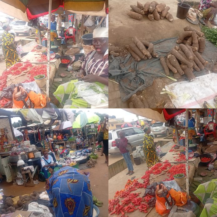 Just a few steps away, Akanbi Esther, a yam seller from Agbamu in Kwara State, leaned on a wooden bench, her baby strapped to her back. A row of yams sat in front of her stall , once symbols of plenty, now reminders of struggle.