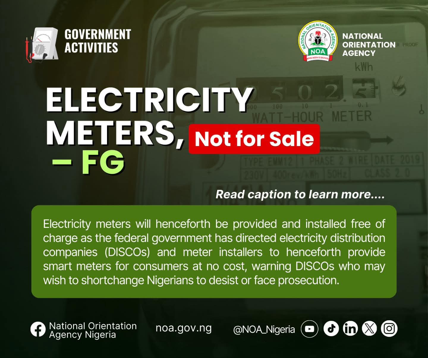 The Federal Government has directed electricity distribution companies (DisCos) nationwide to provide and install smart meters free of charge, warning that any official found demanding payment from consumers risks prosecution.