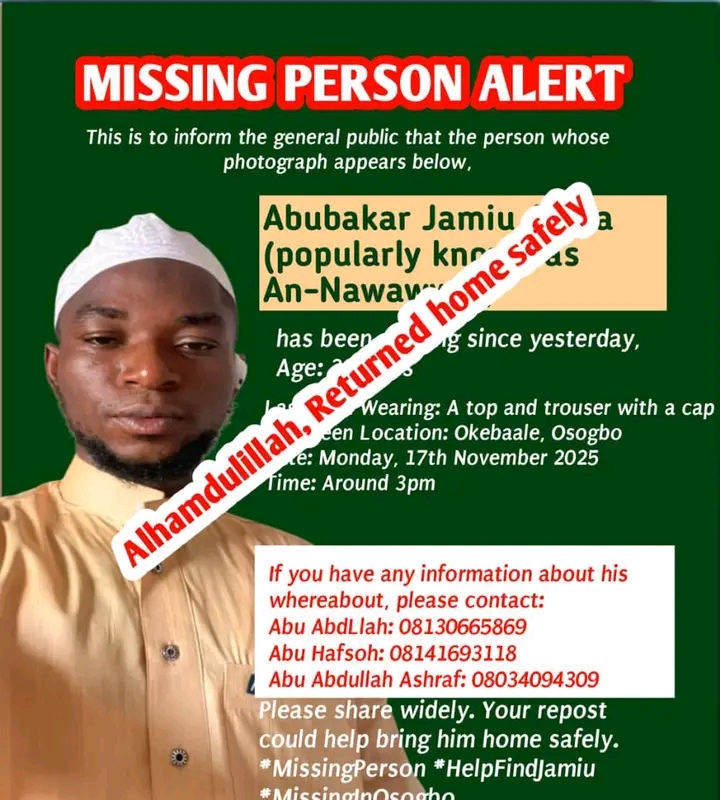 A 30-year-old man, Abubakar Jamiu Alaba, popularly known as An-Nawawwy, who was declared missing in Osogbo, Osun State, has been found.