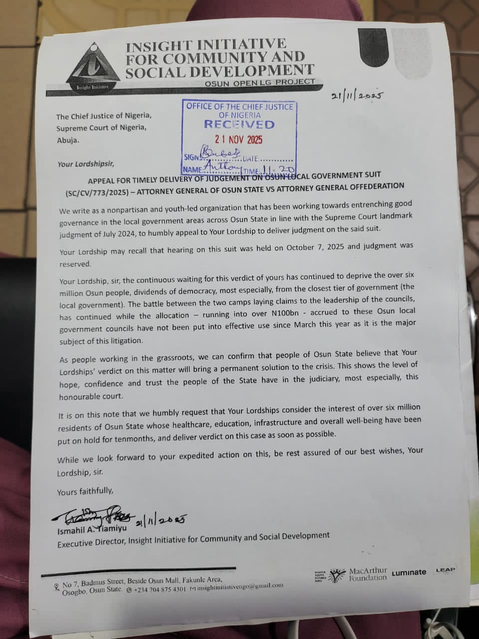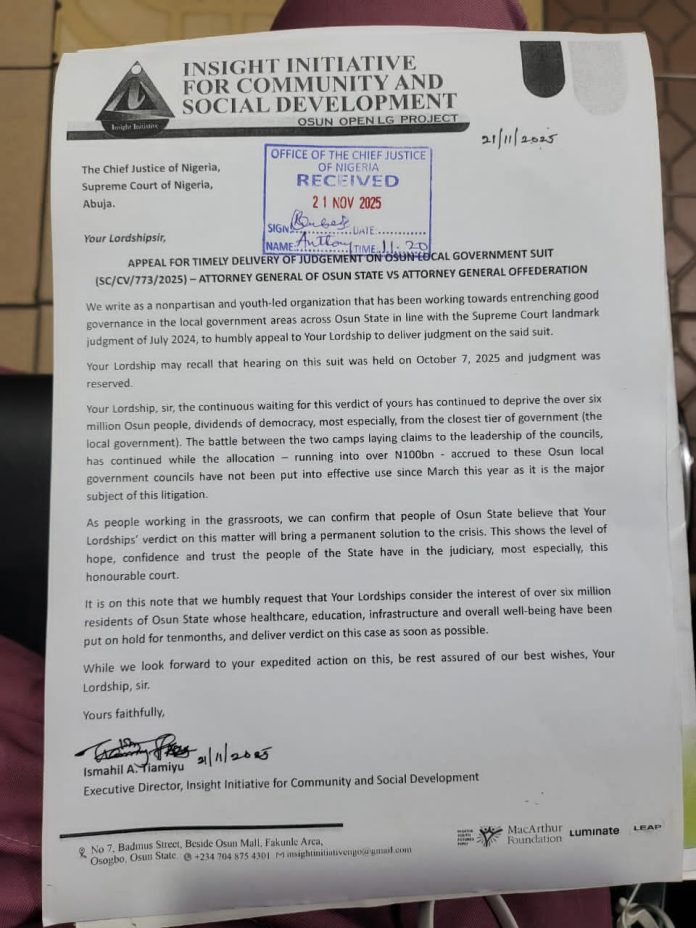 A nonpartisan, youth-led civil society organisation, Insight Initiative for Community and Social Development (IICSD), has called on the Supreme Court of Nigeria to deliver judgment on the long-standing Osun Local Government legal dispute between the Attorney General of Osun State and the Attorney General of the Federation.